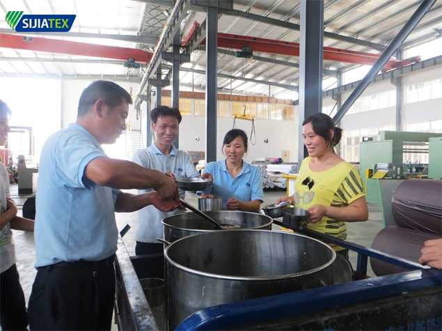 由于订单正处于紧张的生产阶段,一线员工任务量不言而喻,生产车间内一派热火朝天、紧张忙碌的场景。公司职工食堂每天定时熬制绿豆汤,加入白糖,放凉后倒入保温桶内,并送到生产车间。随着桶装的绿豆汤分别送至每个车间,生产一线的员工们陆续拿着自己的杯子接过绿豆汤,并欢快地饮用起来。