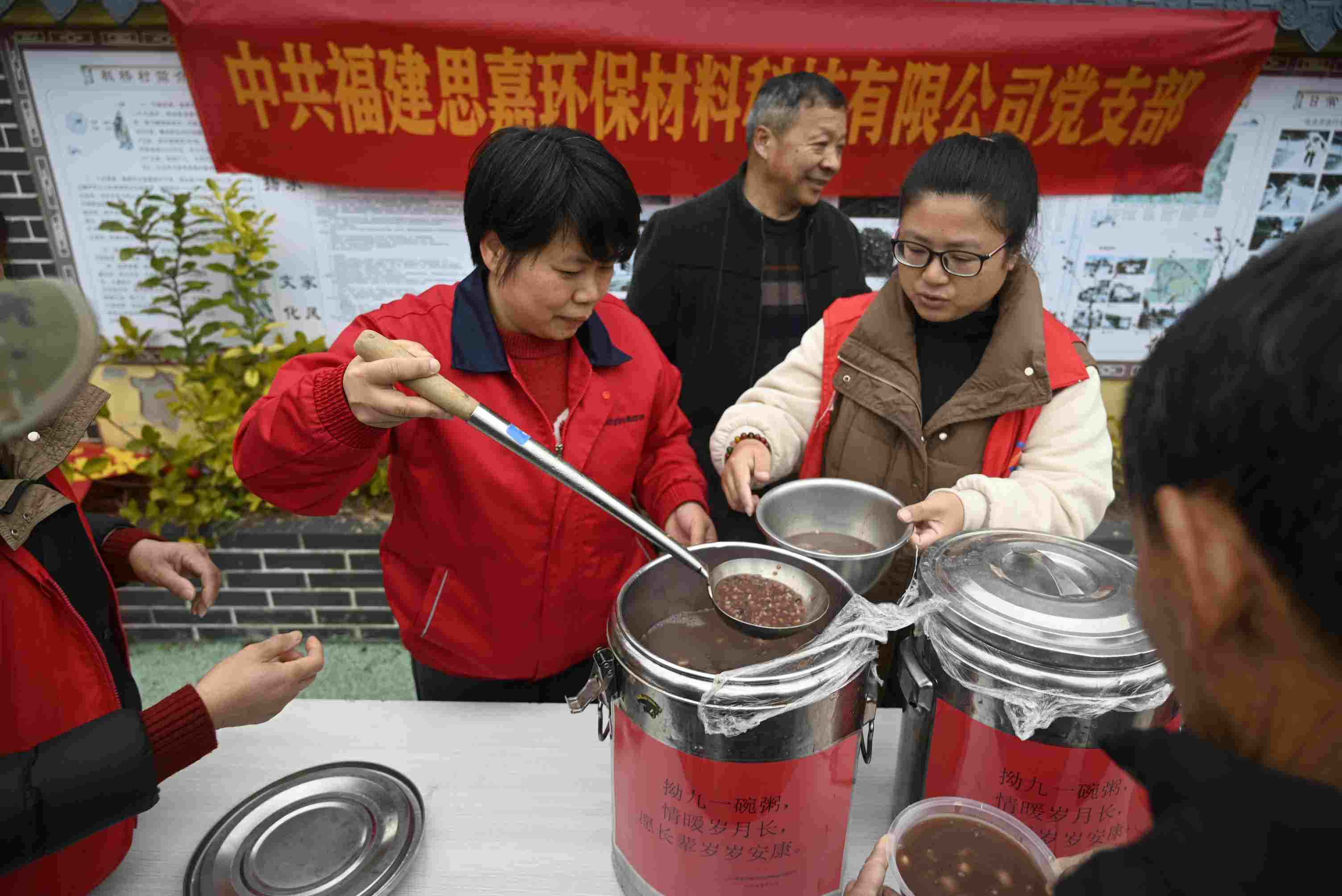 在常态化帮扶之外,思嘉更将公益融入传统民俗,让温暖在节日中传递。每逢拗九节,思嘉便会联合周边村委会开展“拗九暖春”公益活动。活动现场设置了专门的发放点,思嘉人穿戴整齐,有序将熬好的拗九粥盛进碗里,逐一送到前来领取的村民手中。思嘉人将一碗碗熬煮入味的拗九粥送到村民手中,用传统美食传递邻里温情,让全村老少在春日里感受到浓浓的关爱。